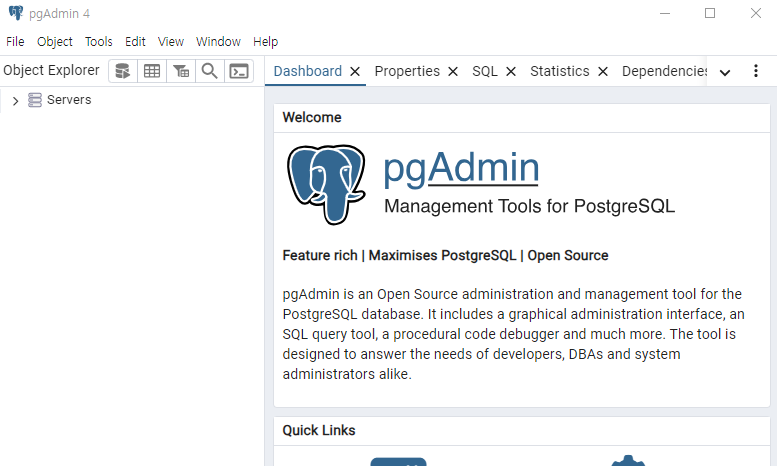 pgAdmin 4를 실행하여 오른쪽 목록에 있는 Servers를 클릭하고, 기본적으로 연결되는 서버인 PostgreSQL 17에 접속할 수 있습니다. 서버 접속을 위해서는 설치 시 지정했던 비밀번호를 입력해야 합니다.