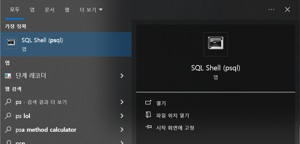 잠시 SpringBoot 프로젝트를 내려두고, Windows 검색에서 psql을 입력하여 SQL Shell을 실행합니다.