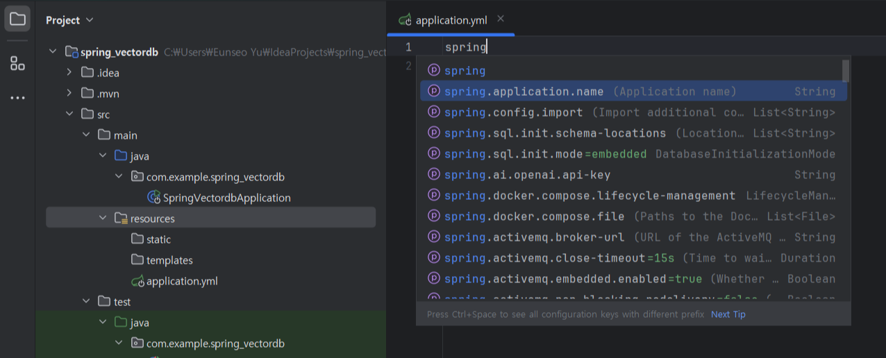 IDE로 프로젝트를 연 후 application.properties 파일을 선택하여 우클릭 > refactor > rename 으로 들어가서 파일 형식을 properties가 아닌 yml 로 변경합니다. 기존에 properties 형식으로 작성되어 있던 코드를 지우고 spring을 입력하면 자동 완성으로 name을 지정할 수 있습니다.