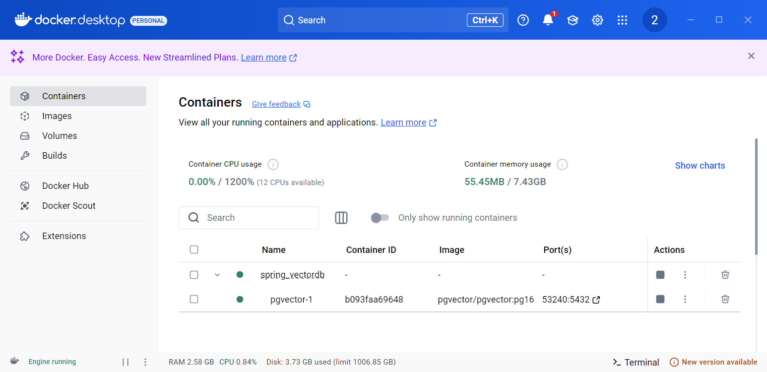 다시 돌아가서, SpringBoot 프로젝트를 Run 하면 Docker compose 파일이 실행되면서 vectordb-pgvector 이미지가 pull 받아집니다. 정상 실행이 됐다면, Docker Desktop에서 실행되고 있는 Container와 image를 확인할 수 있습니다.
