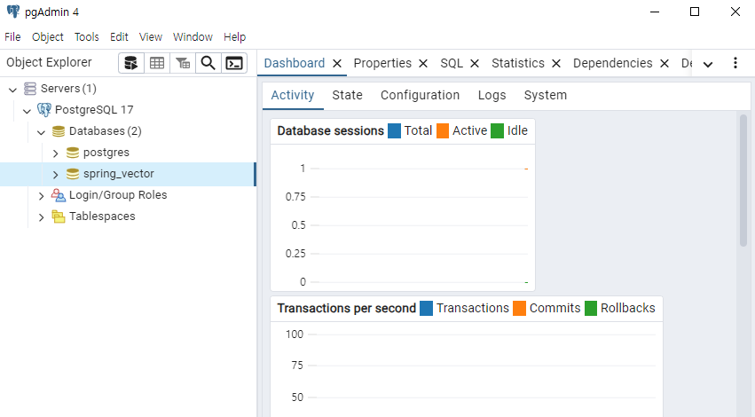 이후 Databases 목록에서 기본 DB인 postgres 아래에 새로 생성한 DB인 spring_vector를 확인할 수 있습니다. 만일 연결이 되지 않은 아이콘으로 보이더라도, 클릭하면 자동으로 연결됩니다.