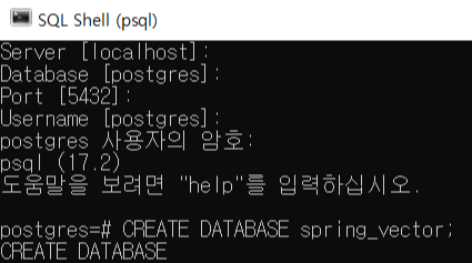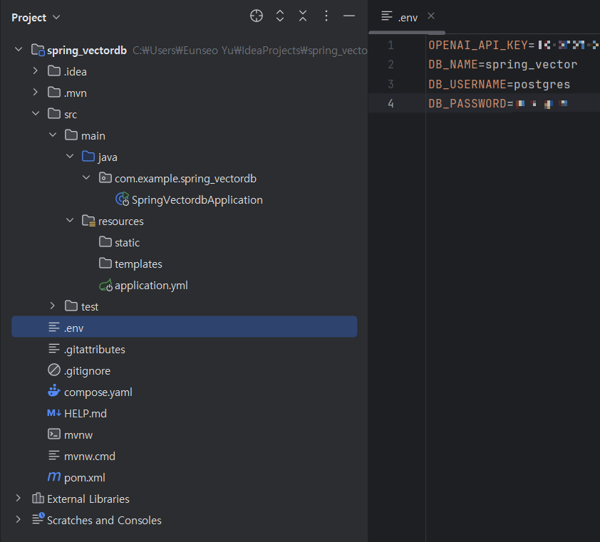 실제로는 콜론을 제외하고 실제 OpenAI API 키 값, 사용할 DB의 이름, DB 사용자 이름, DB 사용자의 비밀번호 값을 입력하면 됩니다. 기본적으로 DB_USERNAME은 postgres, DB_PASSWORD는 PostgreSQL 설치 시 지정했던 비밀번호 값을 입력하여 사용해도 됩니다. DB_NAME 값은 생성할 DB 이름을 작성하면 됩니다. 저는 spring_vector라는 이름으로 DB를 생성할 예정입니다.