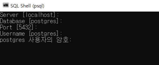 이 Shell에서 현재 Server, Database, Port, Username은 기본값을 사용할 예정이므로, 전부 Enter 키로 넘어갑니다. 이후 사용자의 암호를 입력받는 란에서, 아무것도 쓰여지지 않더라도 설치 시 설정했던 비밀번호를 알맞게 입력 후 Enter 키 입력 시 postgres 유저로 접속이 완료됩니다.